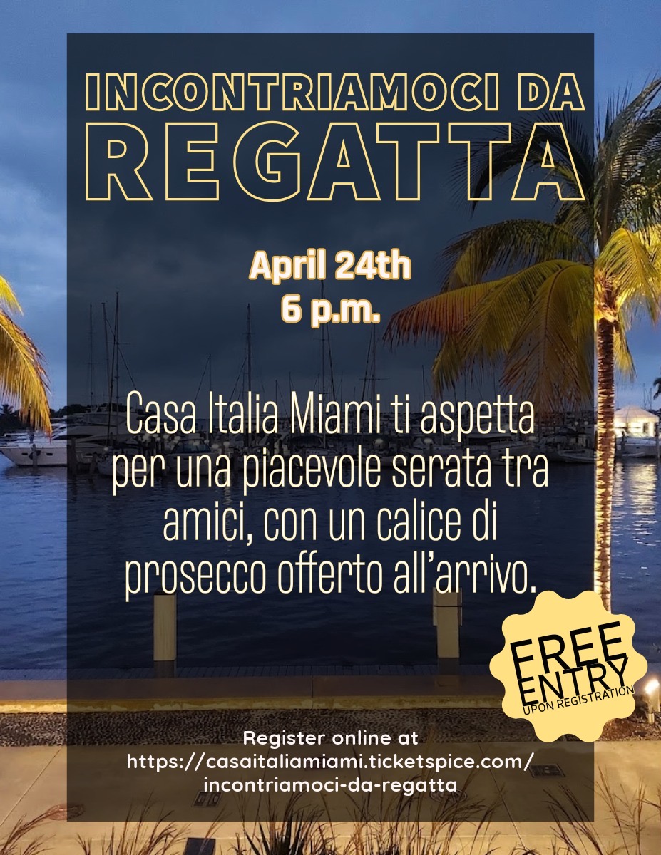 Casa Italia Miami awaits you for a pleasant evening among friends. Bubbles (first glass is offered by Regatta) to break the ice and then…meetings, music, laughter, warmth and friendship.