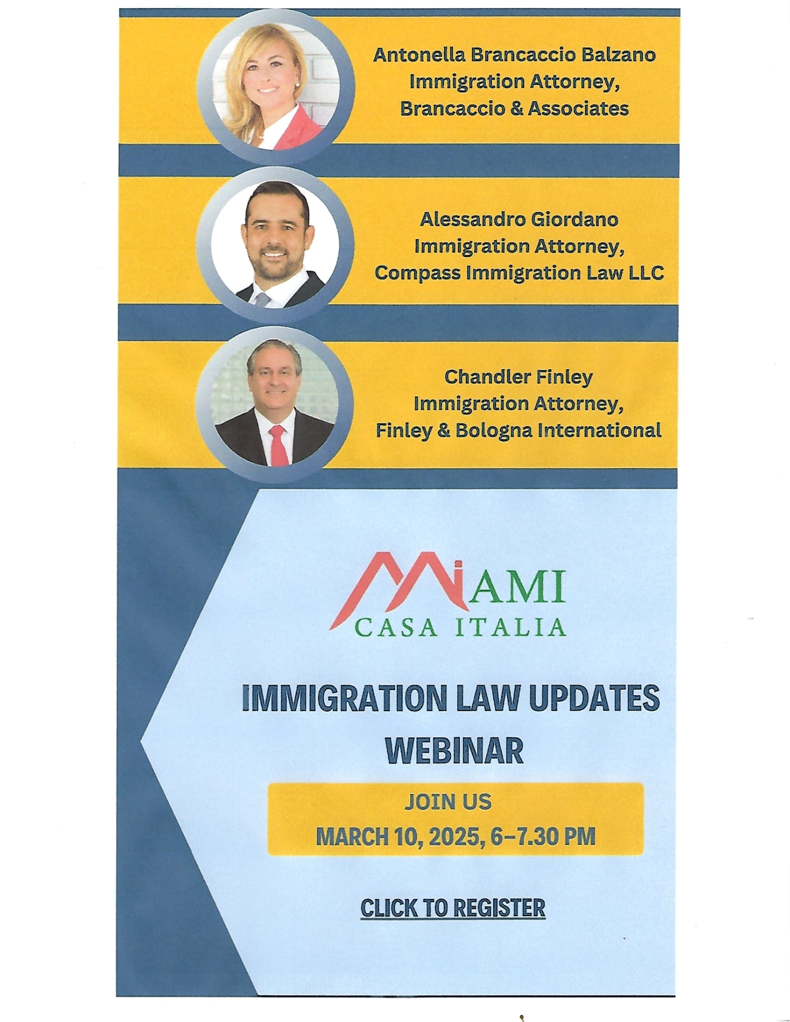 Join Miami Casa Italia for an Immigration Law Updates Webinar on March 10, 2025, from 6:00 to 7:30 PM. Featuring expert immigration attorneys Antonella Brancaccio Balzano, Alessandro Giordano, and Chandler Finley, this webinar will cover the latest legal updates and insights. Click to register and stay informed!